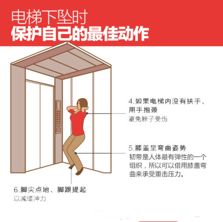 遇到電梯下墜應(yīng)迅速把每層樓的按鍵都按下,這樣當(dāng)緊急電源啟動時,電梯可停止繼續(xù)下墜。如電梯內(nèi)有把手,先一只手緊握把手,然后整個背部跟頭部緊貼電梯內(nèi)墻,以固定人所在的位置,以免摔傷。如電梯內(nèi)沒有把手,則雙手反撐電梯內(nèi)墻,整個背部跟頭部緊貼電梯內(nèi)墻,以固定身體。使膝蓋呈彎曲姿勢,用膝蓋彎曲來承受重?fù)魤毫Α?/p>