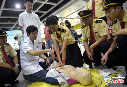 5月8日是第69個(gè)世界紅十字日,省市紅十字會、省中醫(yī)院、廣州地鐵公司,聯(lián)合舉辦以“博愛奉獻(xiàn)、生命救護(hù)、全程為你”為主題的急救技能培訓(xùn)走進(jìn)廣州地鐵活動,多單位攜手將“急救白金十分鐘”的理念和技能送進(jìn)地鐵。