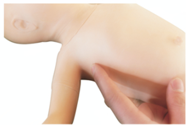 3. 新生兒模型右側(cè)腋窩處可觸及電源開關(guān),將開關(guān)打開狀態(tài)時有語音提示“歡迎使用本公司產(chǎn)品”;