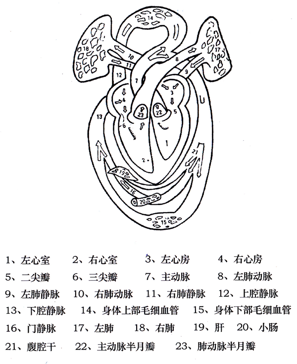 心臟內(nèi)部結(jié)構(gòu)及體循環(huán)與肺循環(huán)示意圖