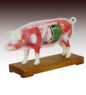 本模型右側(cè)示雄性上海大白豬的體形,以及自頭頸部、軀干、臀尾部和前后肢分布的常用針穴55個。左側(cè)示淺層肌肉,并切除體壁,示脊柱和內(nèi)臟結(jié)構(gòu)。用PVC制成,供獸醫(yī)作參考用。