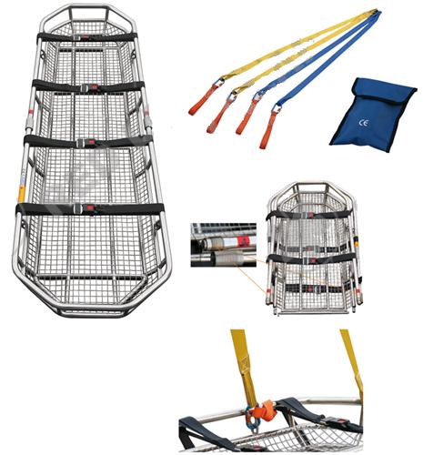 此擔(dān)架的構(gòu)造著眼于急救的特殊性,如崎嶇的山區(qū)、空中或海上救援。框架堅(jiān)固耐用,簡(jiǎn)便可靠的裝置讓操作人員能夠安全快捷的采取急救措施。懸鉤能與飛機(jī)上掛鉤連接,實(shí)現(xiàn)野外救援。擔(dān)架配有可調(diào)節(jié)的腳部安全機(jī)械裝置,安全帶等。材質(zhì)采用無(wú)毒無(wú)污染釋放的材料,具有防火和耐磨損和防侵蝕的功能,由不銹鋼管和網(wǎng)制成,不會(huì)對(duì)病人造成另外的傷害,比普通擔(dān)架更牢固,可與板式擔(dān)架一起使用,可分成兩部分,易運(yùn)輸和儲(chǔ)存。