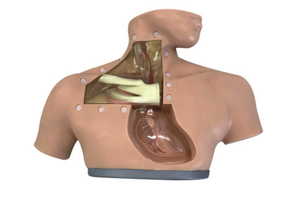 該模型用于經(jīng)中心靜脈插管患者給予腸外營養(yǎng)的治療和護(hù)理,訓(xùn)練中心靜脈置管和相關(guān)消毒、穿刺、固定等操作。