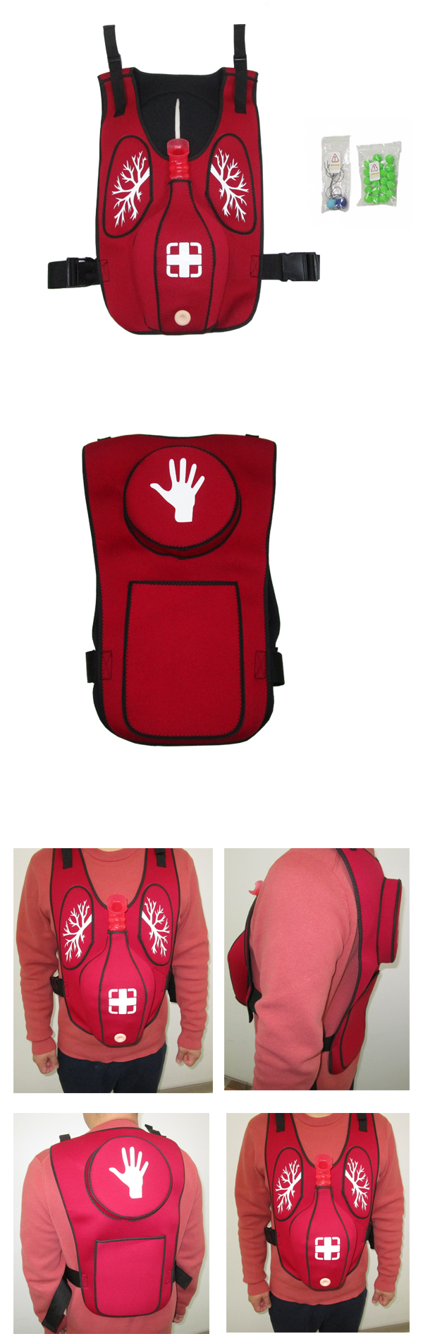 救援培訓(xùn)專用窒息梗塞急救實訓(xùn)穿戴馬甲,可有效避免因窒息急救不及時導(dǎo)致生命安全受到傷害。防窒息急救教育和實訓(xùn)的時候,穿戴在學(xué)員身上,針對異物造成的呼吸氣道堵塞狀況時,練習(xí)腹部按壓(即海姆立克手法),做出正確步驟處理,擠出堵塞氣道異物(異物塞).直觀的教學(xué)模式給學(xué)員帶來自信和應(yīng)用實效。模擬者可采用站姿、坐姿、用教具或借助柜臺、桌椅,實習(xí)體驗窒息自救、急救、達(dá)到救人一命的教學(xué)目的。