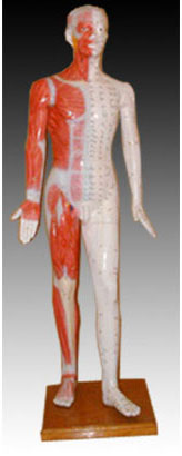 這款彩色的塑料模型非常詳細(xì)地標(biāo)明了14條主要經(jīng)絡(luò)線,身體右側(cè)是361個(gè)經(jīng)穴和48個(gè)經(jīng)外穴以及骨度線,即用“寸”來(lái)方便地測(cè)量針灸點(diǎn)之間的距離。身體左側(cè)是皮下組織,顯示神經(jīng)系統(tǒng)分布、動(dòng)靜脈、血管和肌肉構(gòu)造,還標(biāo)明了在主要經(jīng)絡(luò)線上沒(méi)有標(biāo)明的手足部的經(jīng)外穴。適用于中醫(yī)教學(xué)、針灸和推拿等。用玻璃鋼制成。尺寸:178CM高。