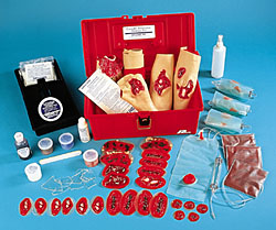 Make first aid courses an unforgettable experience, and add realism to your training exercises! A "hands-on" kit designed for all levels of flrst aid training. Contains simulated wounds of the most commonly found injuries, and teaches students to recognize and properly treat these wounds in an emergency. Contains 24 assorted replicas of various fractures, lacerations, and wounds. Each replica can be quickly and easily attached to "victims" with Velcro® straps. A generous supply of assorted makeup materials provides an even greater realism for your training exercises, along with five portable reservoirs with pumps to create actual bleeding wounds. Durable carrying case.